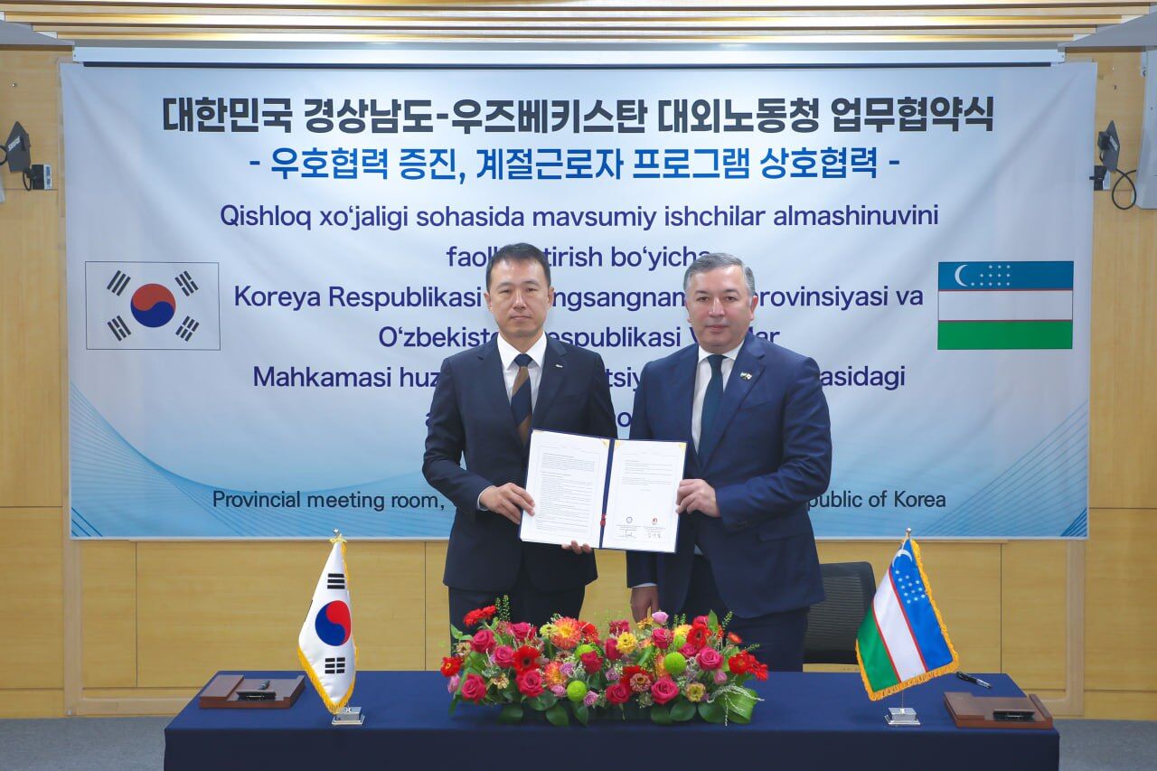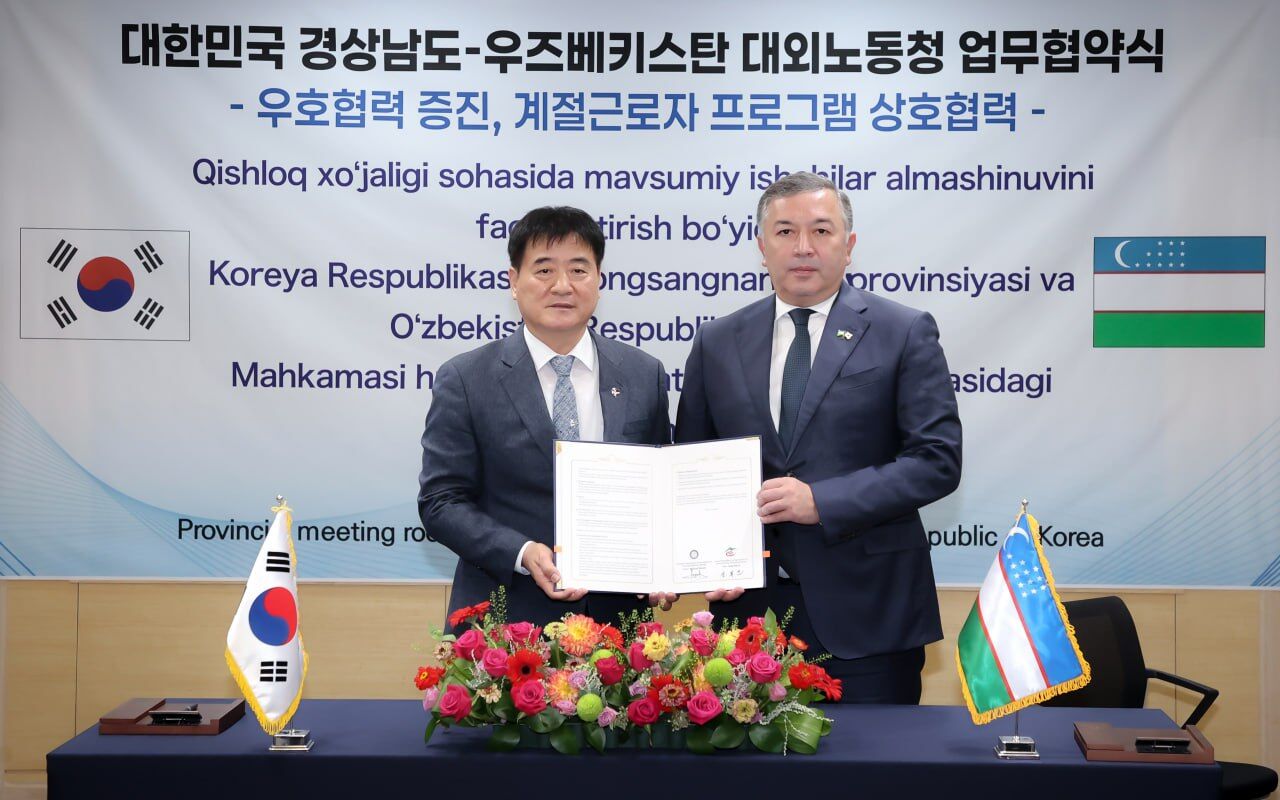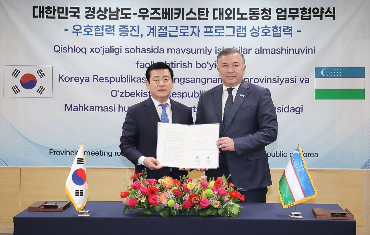 Агентство миграции Узбекистана и правительство провинции Кёнсан-Намдо подписали меморандум о двустороннем сотрудничестве в сфере привлечения сезонной рабочей силы для аграрного сектора.