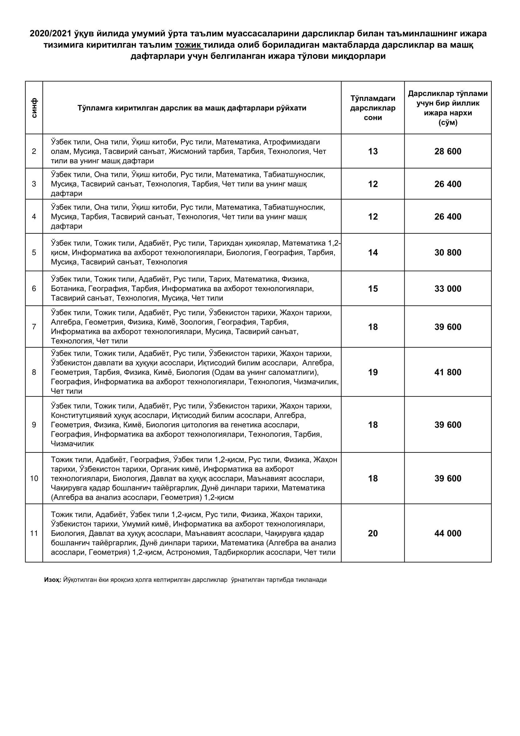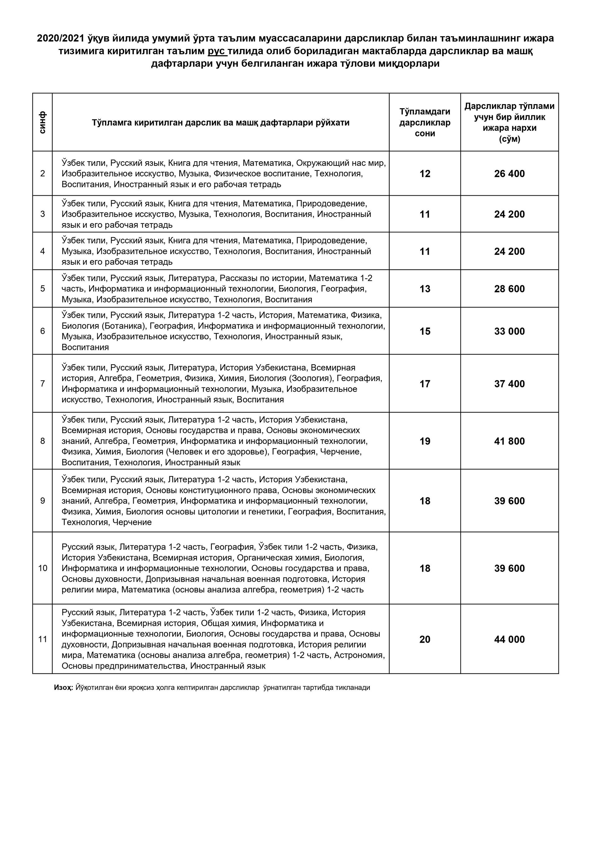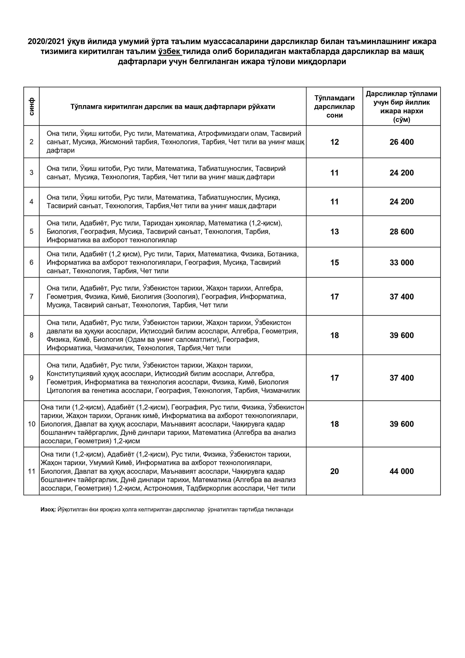 Бунда, бир дона дарслик ёки машқ дафтари учун ягона ижара тўлови 2200 сўм ҳисобланиб, тўплам таркибидаги дарсликлар ва машқ дафтарлари сонидан келиб чиқиб, синфлар ва таълим тиллари кесимида ижара тўлови миқдорлари белгиланди.
