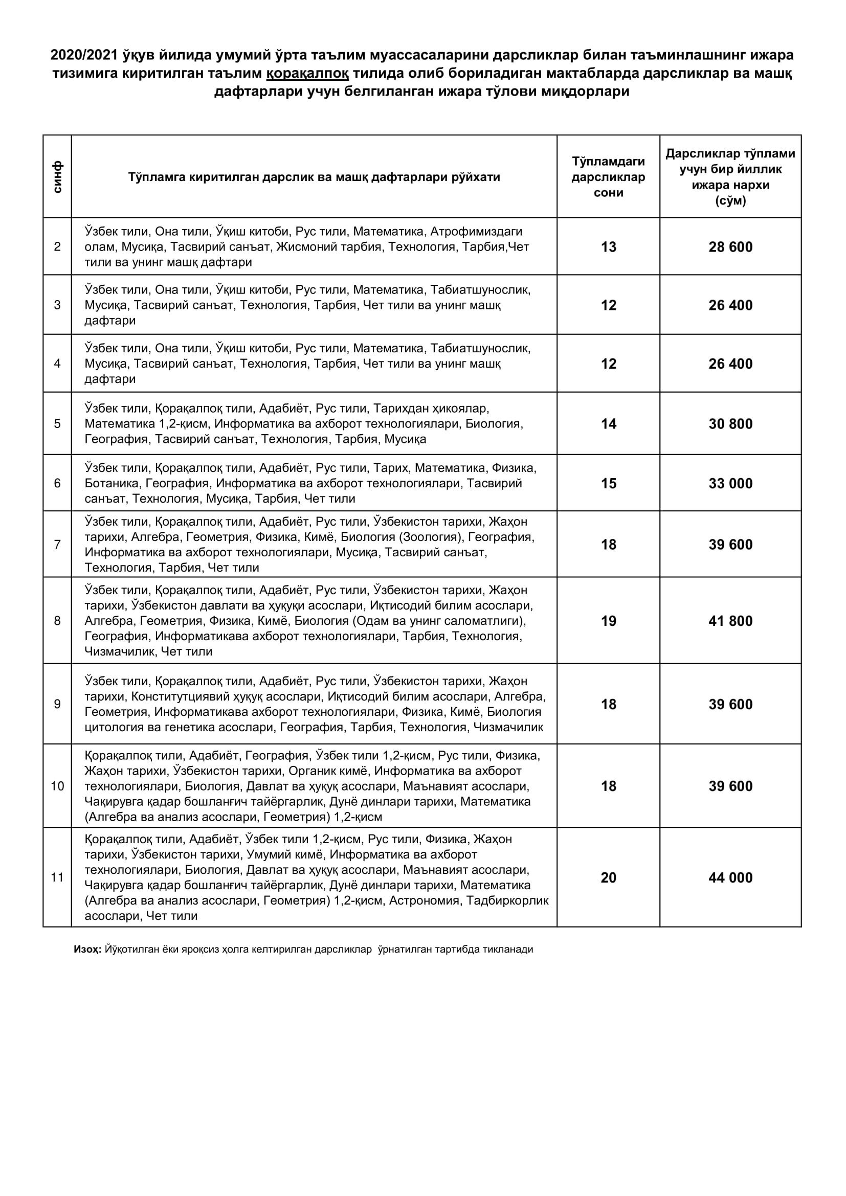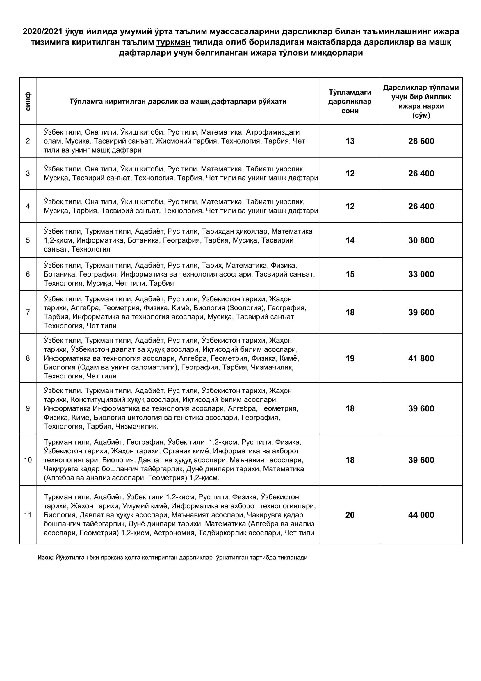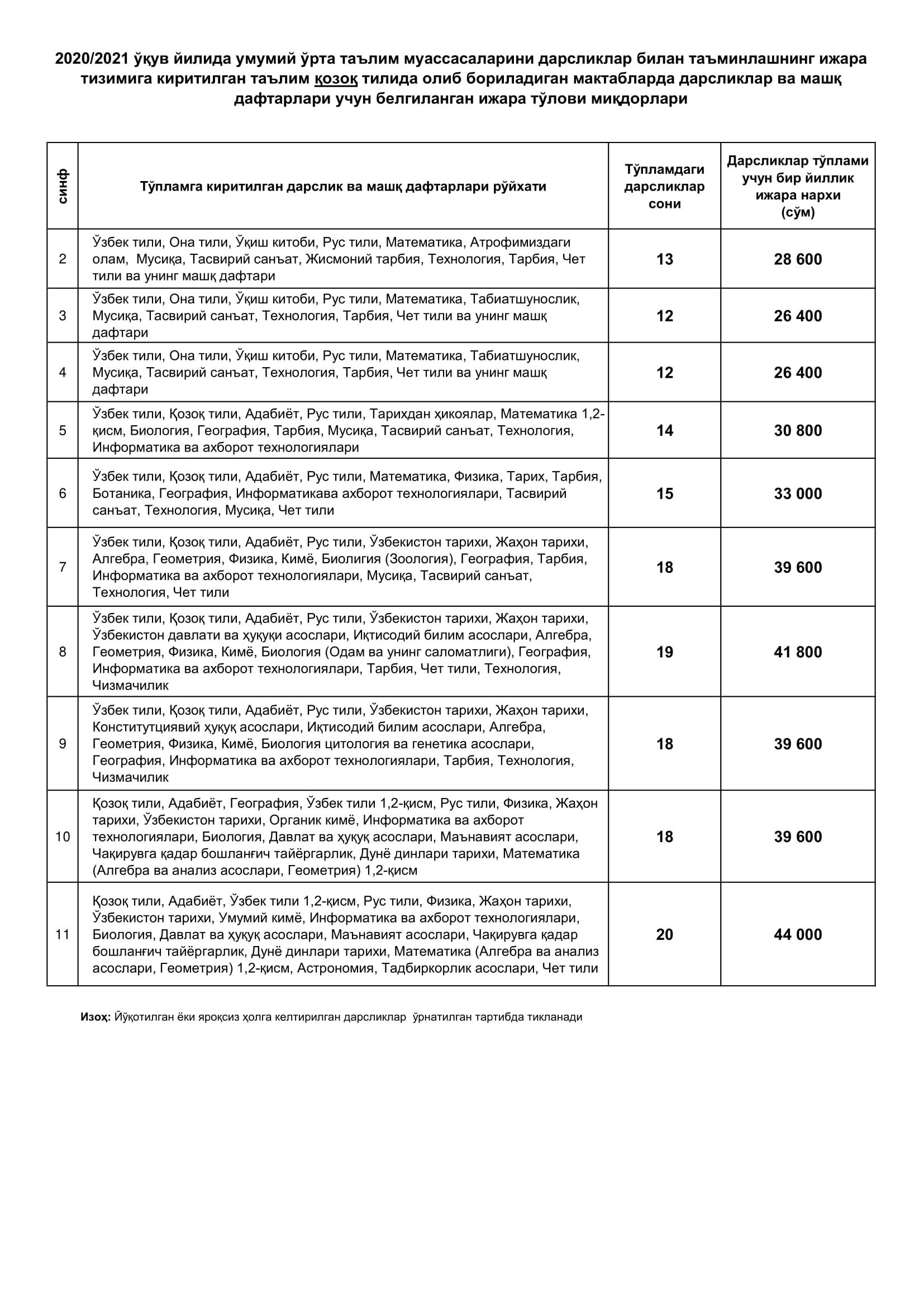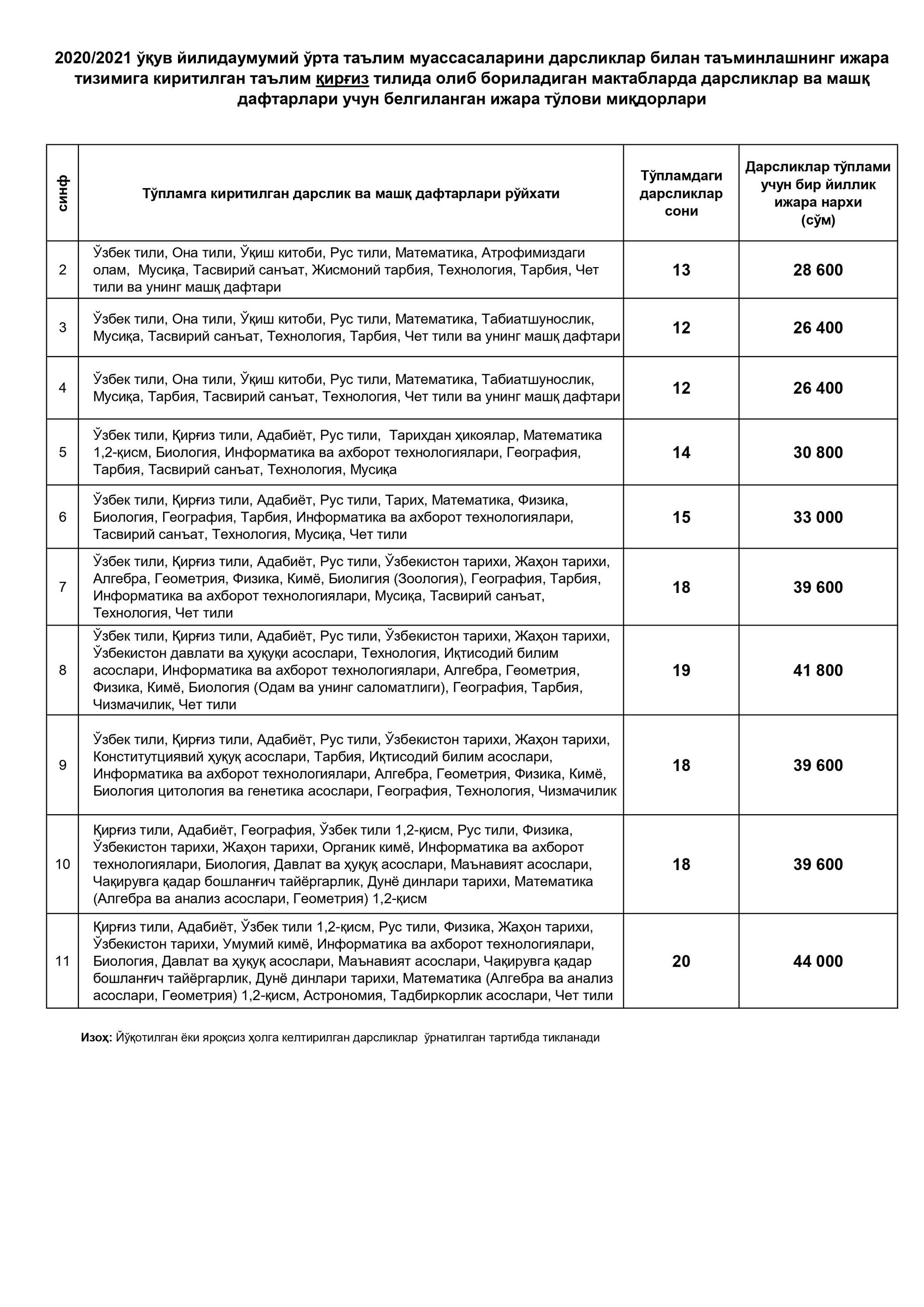 Бунда, бир дона дарслик ёки машқ дафтари учун ягона ижара тўлови 2200 сўм ҳисобланиб, тўплам таркибидаги дарсликлар ва машқ дафтарлари сонидан келиб чиқиб, синфлар ва таълим тиллари кесимида ижара тўлови миқдорлари белгиланди.