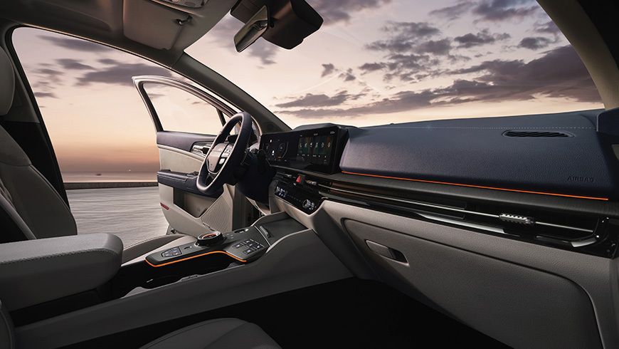 Салон нового Kia Sportage выполнен в современном стиле с чётко выраженным горизонтальным зонированием. Передняя панель ориентирована на водителя, а панорамный изогнутый экран объединяет 12,3” цифровую приборную панель и 12,3” дисплей мультимедийной системы, создавая эффект полного визуального погружения. В базовой версии используется приборная панель Supervision с цветным экраном 4,2”.