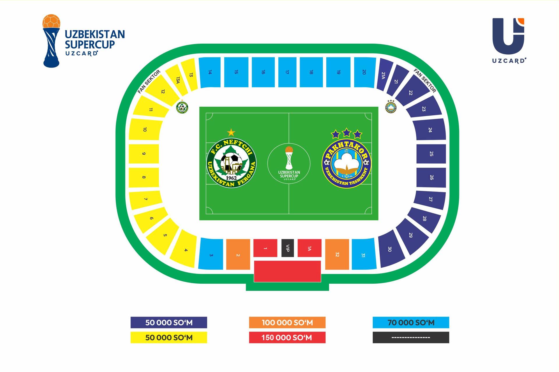 Болельщикам «Нефтчи» рекомендуется приобретать билеты в секторах 1–15, тогда как поклонникам «Пахтакора» — в секторах 19–32 (1А). Билеты в сектора 16–18, а также в некоторые дополнительные сектора, выделенные для клубов, планируется продавать в кассах стадиона «Бобур Арена».