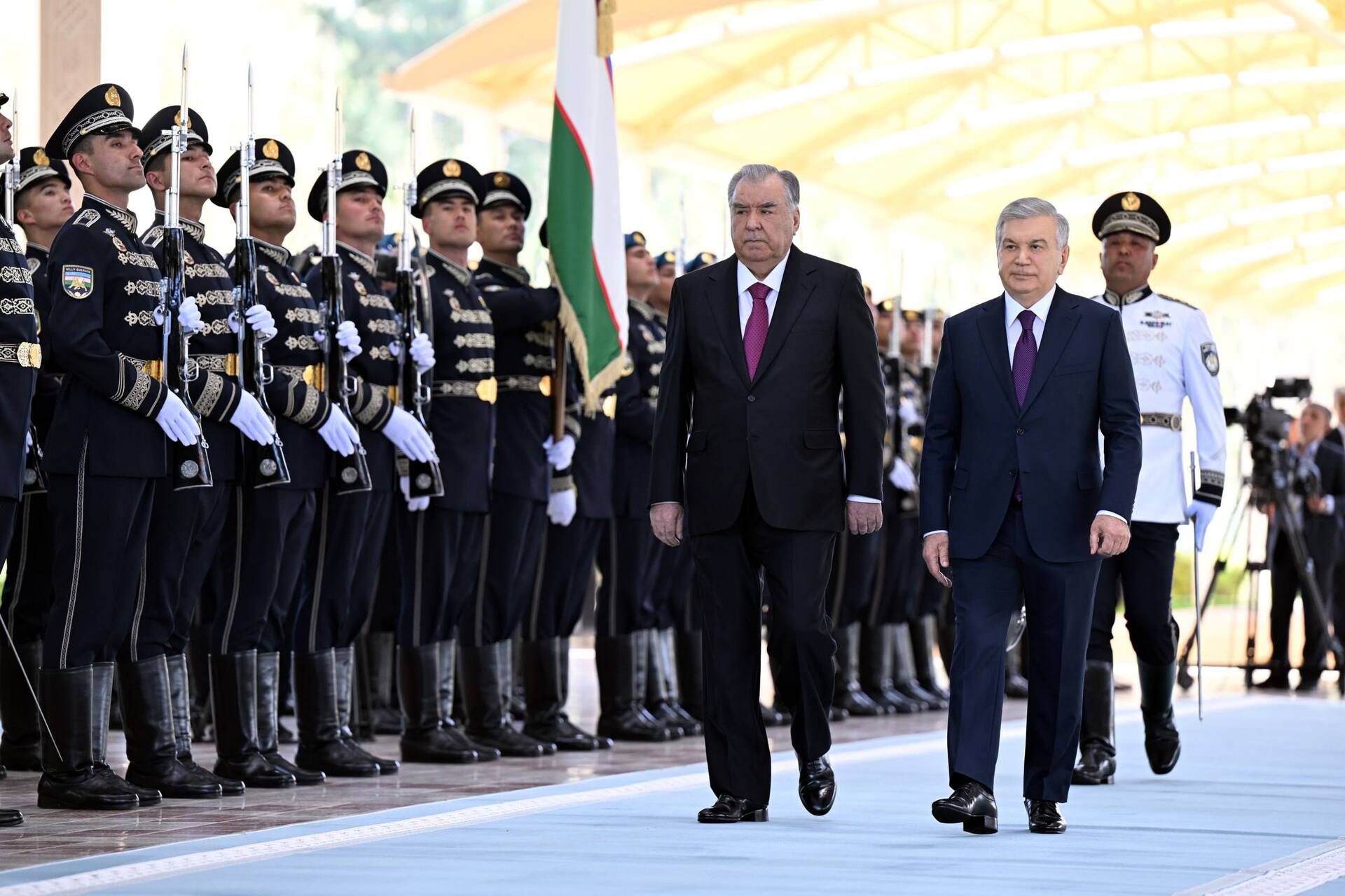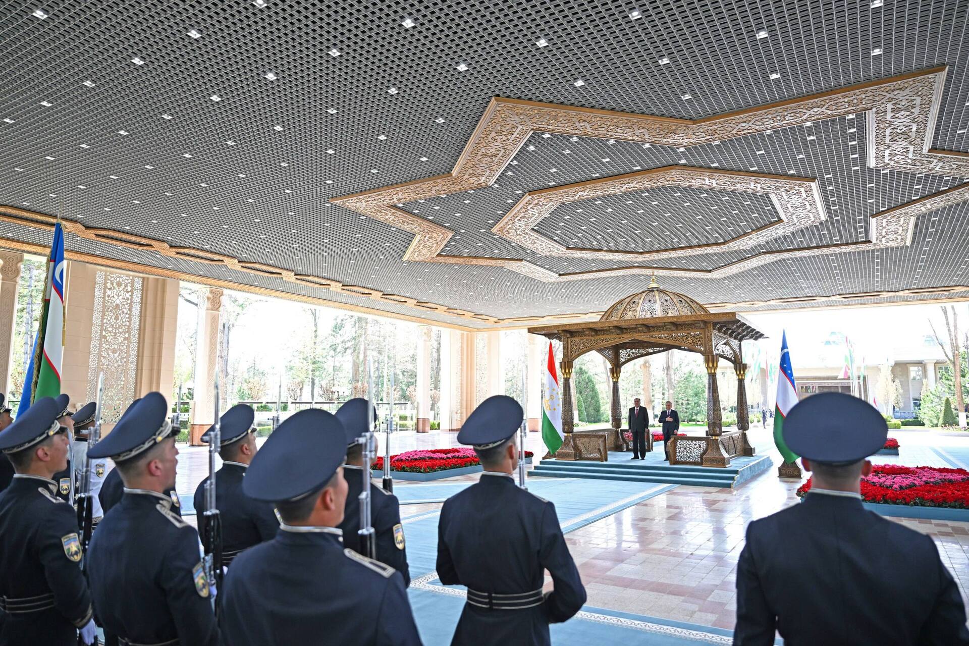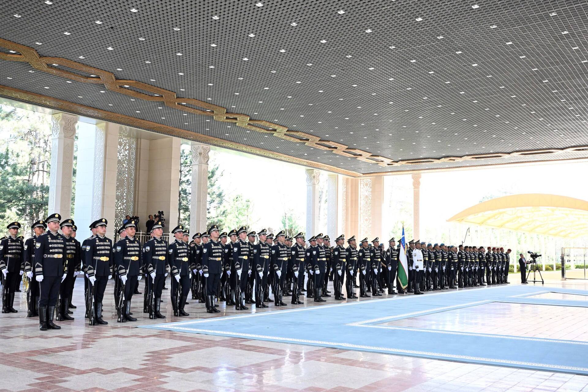 В начале церемонии Шавкат Мирзиёев, тепло встретив высокого гостя, пригласил его на трибуну. Были подняты государственные флаги двух стран и выстроен почетный караул. В исполнении военного оркестра прозвучали гимны двух стран. Президенты обошли строй Почетного караула и поприветствовали членов официальных делегаций.