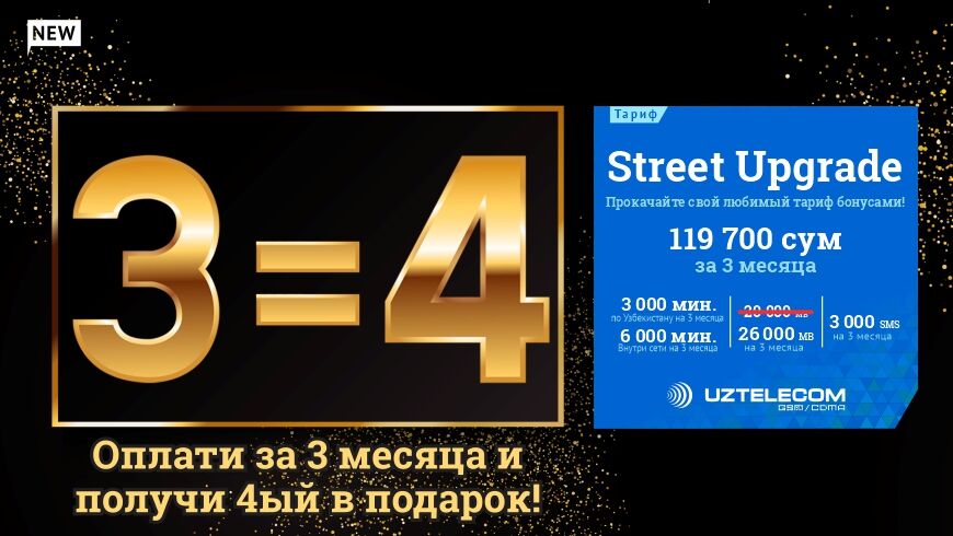 Подключить тариф «Street Upgrade» можно через USSD команду *111*2*11*4*1# либо посредством отправки SMS с кодом 1004 на короткий номер 99880.