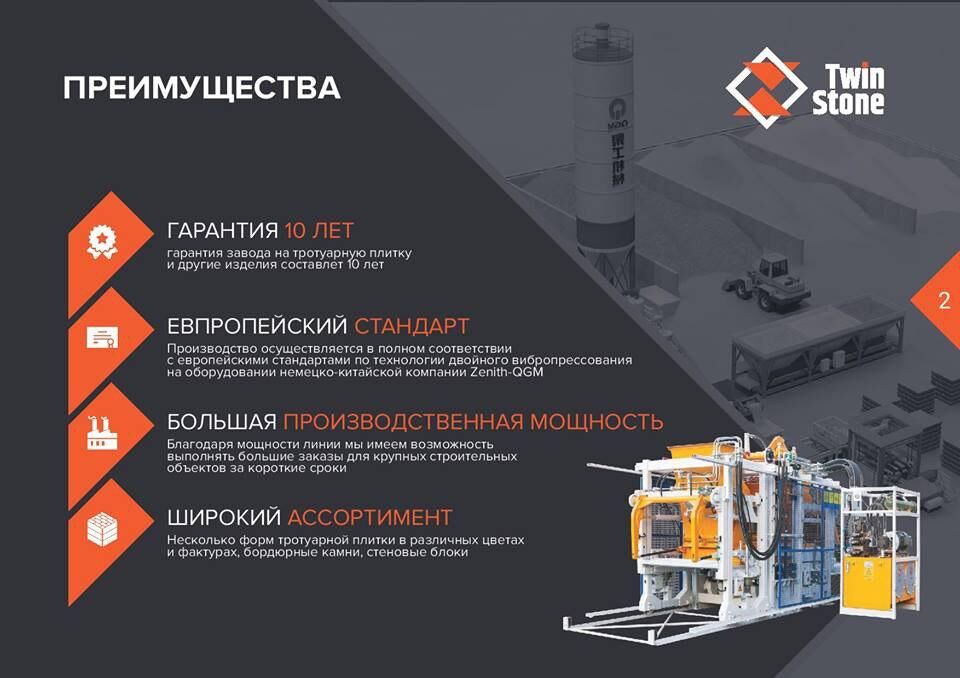 Качественная тротуарная плитка TwinStone очень быстро завоевала признание специалистов строительной области Узбекистана. В настоящее время в арсенале компании: высокопроизводительная стационарная машина, формующая бетонные изделия на технологических поддонах, способная выпускать до 900 м² продукции за смену.