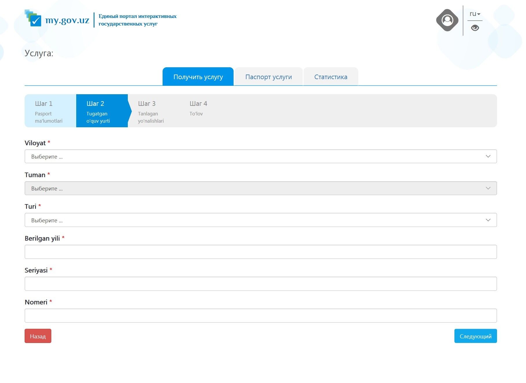 2-қадам. Сиз тугатган ўқув муассаси ҳақида ахборот киритиш (коллеж, лицей ёки мактаб).