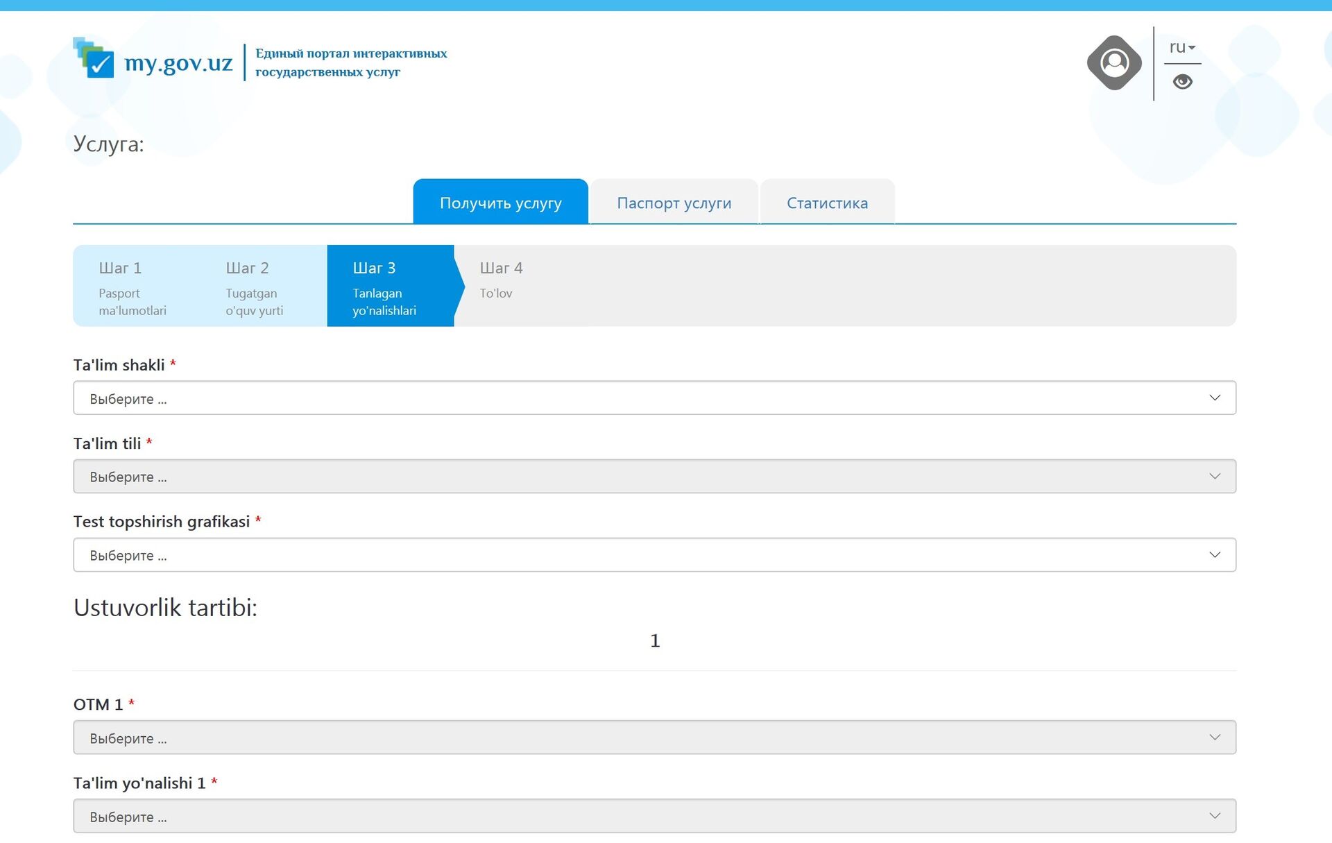 3-қадам. Ўқув шаклини (кудузги, кечги, сиртқи) ва тилини танлаш, тест топшириш графикини белгилаш.
