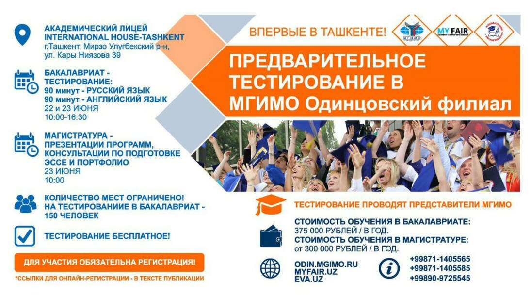22 и 23 июня текущего года для выпускников Узбекистана, поступающих в бакалавриат МГИМО-Одинцово, будет организовано предварительное тестирование на знание русского и английского языков.