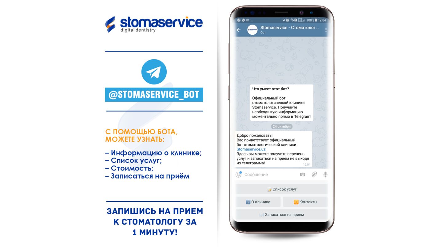 С помощью бота @stomaservice_bot любой желающий может записаться на прием менее чем за две минуты, а также ознакомиться со всеми услугами клиники и прайс-листом.