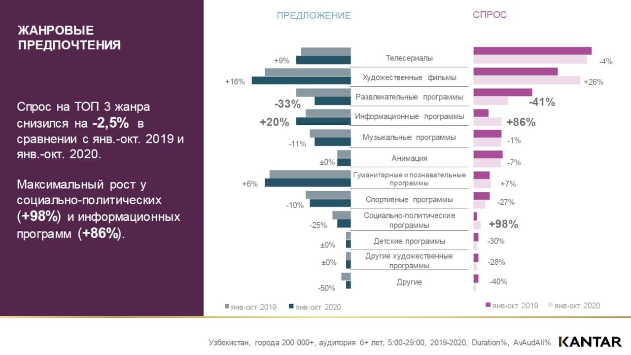 Асосий жанрлар бўйича таҳлил қилинганда, жорий даврда кўнгилочар дастурлар таклифи ҳам, унга бўлган талаб ҳам камайганини кўришимиз мумкин.