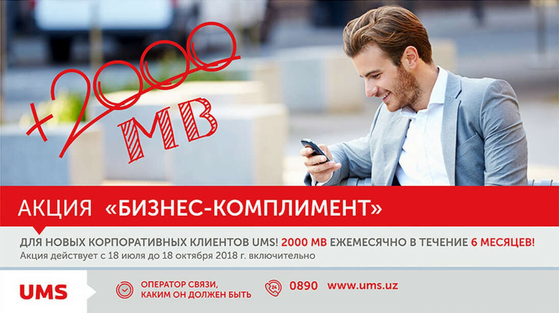 Компания UMS, являясь надежным помощником корпоративных клиентов,постоянно внедряет эксклюзивные предложения на мобильном рынке Узбекистана. Так, в эти дни оператор проводит акцию «Бизнес-комплимент». В рамках нее новые, а также действующие корпоративные клиенты UMS при подключении новых номеров будут получать специальный бонус – по 2000 MB на каждый номер в течение полугода. Предложение действительно при подключении к тарифным планам «Corporate 777», «Corporate Maxi», «Corporate Ultra», «Corporate Perfect».