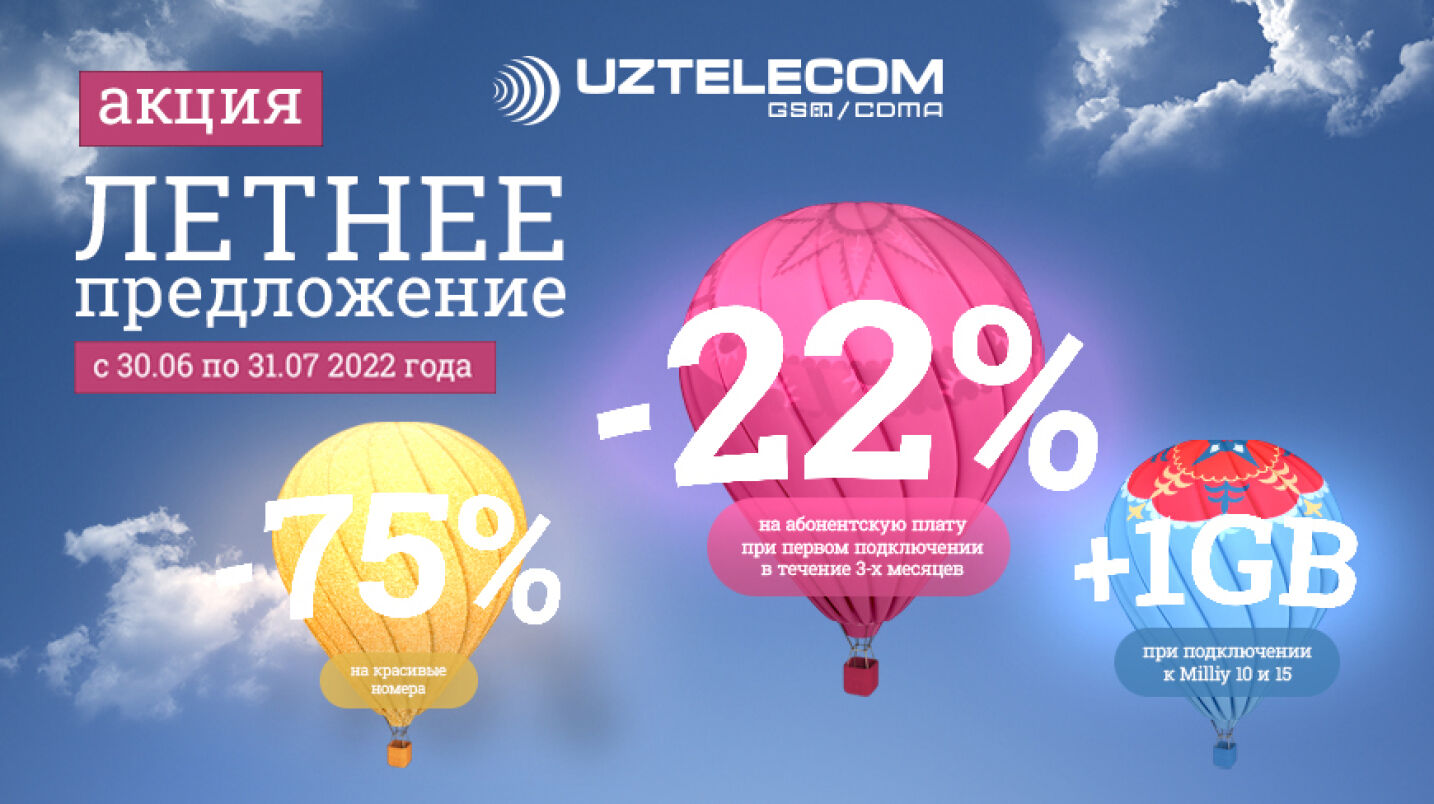 «Летнее предложение» от UZTELECOM – это 3 полезные акции, с которыми ваше мобильное общение станет еще более выгодным и удобным. Бонусные гигабайты, скидки на абонентскую плату и, конечно, акция на золотые номера – этим летом вы получаете тройную выгоду мобильного общения. Напоминаем, что «Летнее предложение» действует до 31 июля 2022 года.
