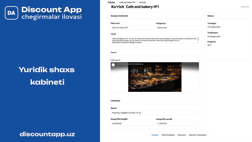 DA (Discount App) платформаси бизнес учун рақамли шерикчилик имкониятини тақдим этади. Ҳар бир қўшилган компанияга шахсий кабинет берилади ва унда чегирма ҳамда махсус таклифларни мустақил равишда жойлаштириш ва бошқариш мумкин. Платформага уланиш ва ундан фойдаланиш бепул бўлиб, техник хизмат кўрсатиш учун қўшимча тўлов талаб қилинмайди.