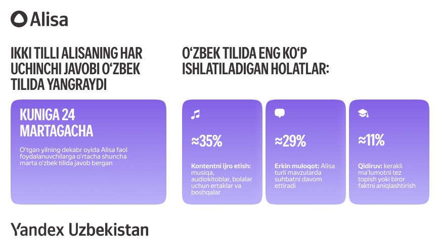 Ўтган йилнинг сентябрь ойида Yandex Uzbekistan ақлли колонкаларда ўзбек тилини қўллаб-қувватлайдиган икки тилли СИ-ассистенти Алисани тақдим этди. Шундан буён Алисадан ўзбек тилида фойдаланиш кўрсаткичлари барқарор равишда ошиб бормоқда.