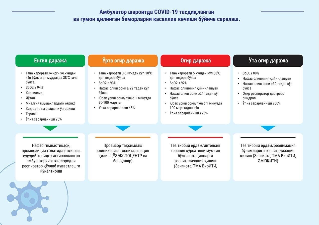 Унга кўра, коронавирус беморлари енгил, ўрта оғир, оғир ва ўта оғир даражаларда сараланади. Шунингдек, сарланган беморларга касаллик босқичларига қараб тегишлича даво чоралари қўлланади.