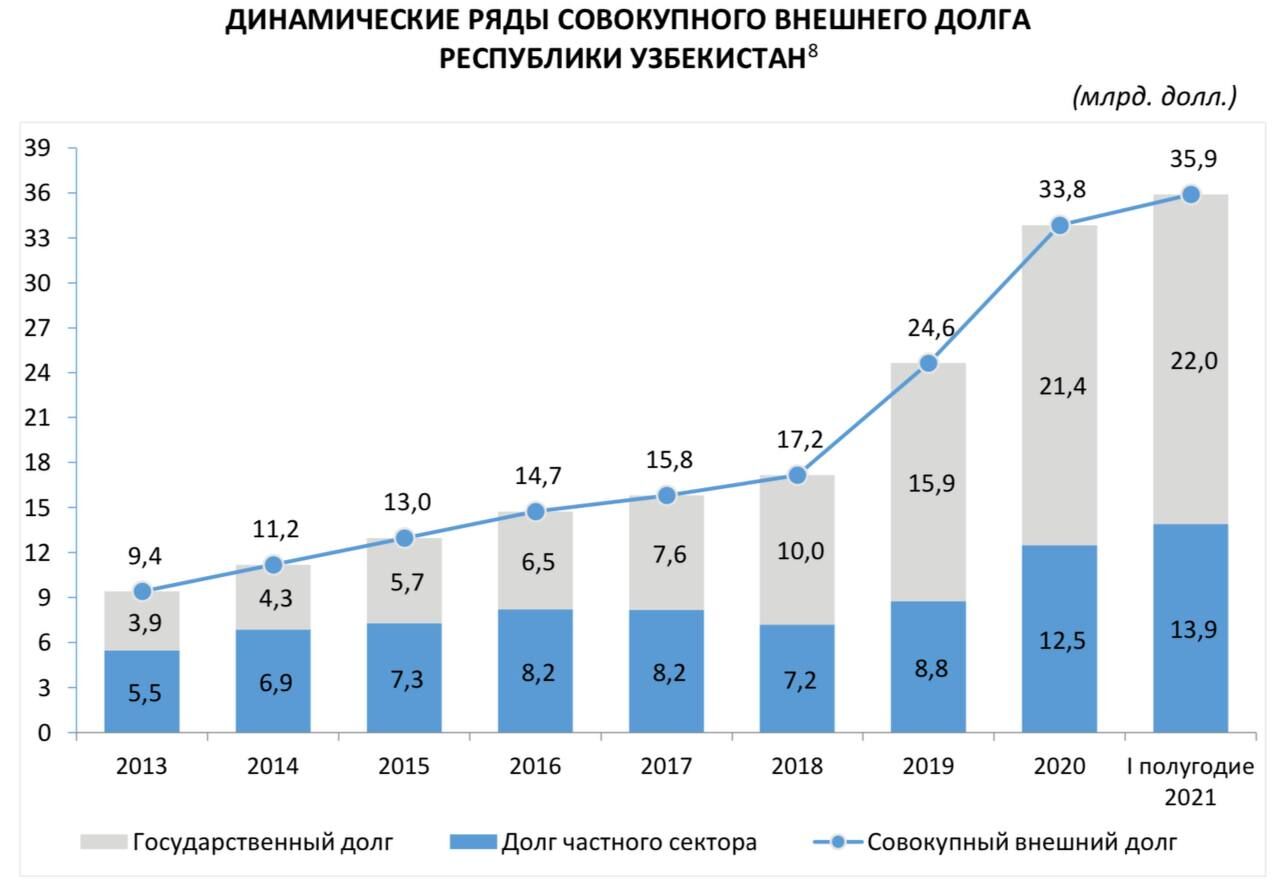 «Объём совокупного внешнего долга Узбекистана по состоянию на 1 июля 2021 года составил 35,9 млрд долларов, увеличившись по отношению к началу 2021 года на 6%, или на 2 миллиарда долларов», — говорится в сообщении Центрального банка.