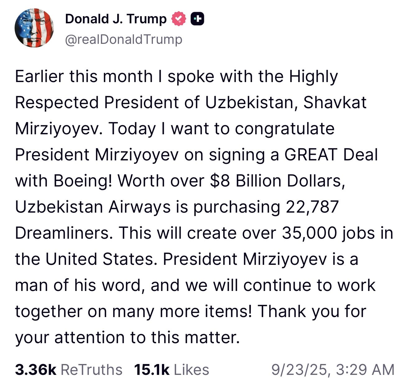 В соцсети Truth президент США Дональд Трамп отметил, что сумма контракта составляет $8 млрд. Это создаст более 35 000 рабочих мест в США. По словам Трампа, Шавкат Мирзиёев — человек слова, и сотрудничество будет продолжаться по многим направлениям.