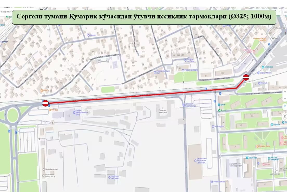 Veolia Energy Ташкент маълумотига кўра, 2025 йил 2–15 октябрь кунлари Сергели туманидаги Қумариқ кўчаси 325 мм диаметрли ва умумий узунлиги 1000 метр бўлган иссиқлик тармоқларини алмаштириш ишлари муносабати билан ёпилади.