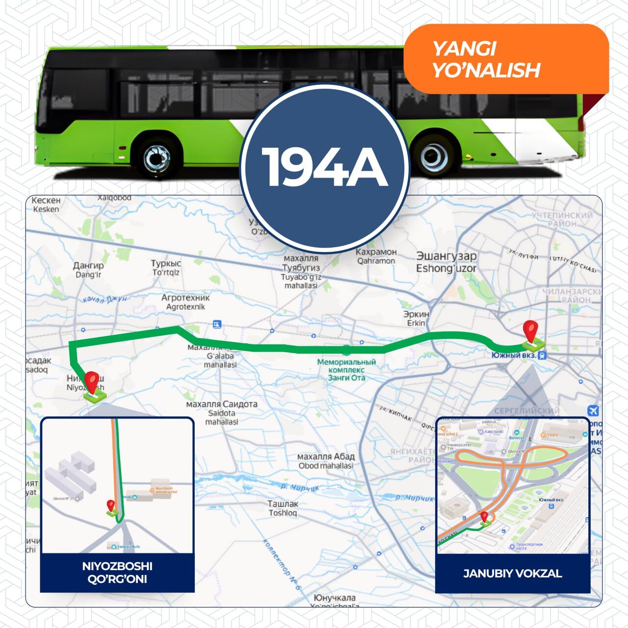 Маршрут №194 будет курсировать от Южного вокзала до махалли «Ниёзбоши» в Ташкентской области.