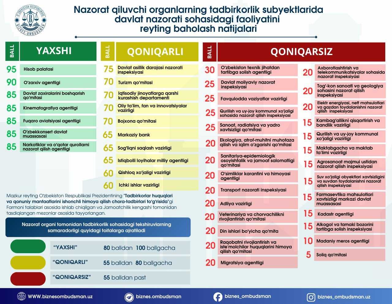 В категорию «хорошо» (от 80 до 100 баллов) вошел ряд ведомств, продемонстрировавших наиболее корректную и взвешенную работу с бизнесом. В частности, Счетная палата получила 95 баллов, Агентство архивов — 90 баллов, а Агентство гражданской авиации, Агентство кинематографии и Комитет по управлению государственными резервами — по 85 баллов.