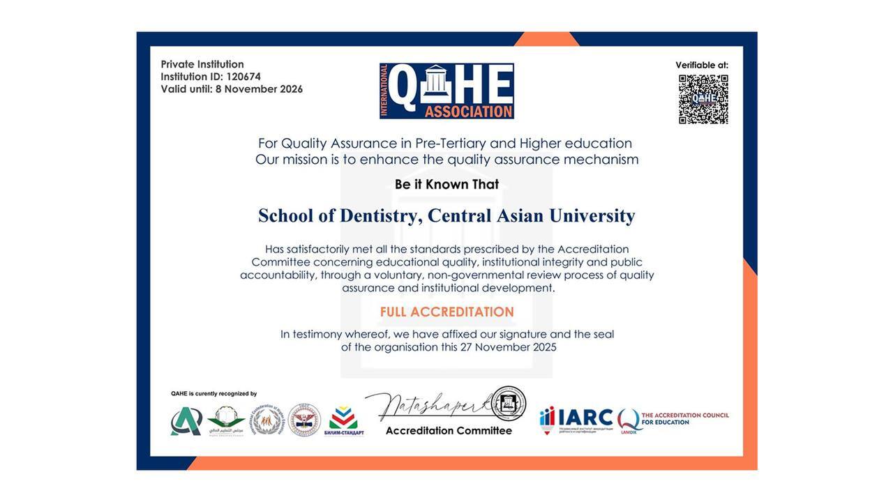 Получение полной международной аккредитации укрепляет академический статус Школы стоматологии Central Asian University и подтверждает её роль в подготовке квалифицированных, практико-ориентированных специалистов, способных эффективно отвечать современным вызовам системы здравоохранения.