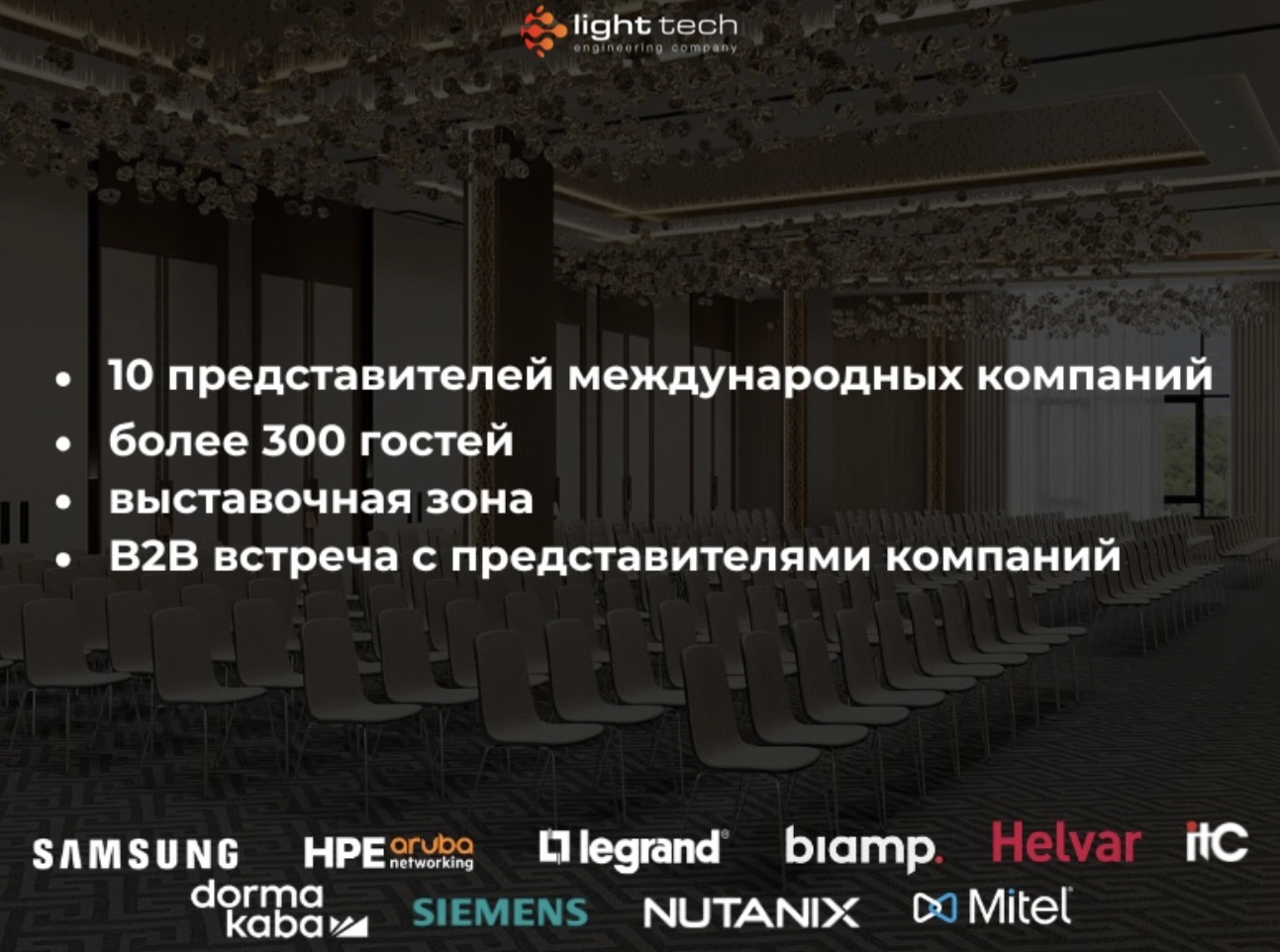 В рамках программы 10 ведущих мировых производителей представят свои инновационные решения для гостиничных и коммерческих объектов. Среди участников: Samsung, HPE Aruba, Dormakaba, Siemens, Legrand, Biamp, Mitel, Helvar, Nutanix и ITC.