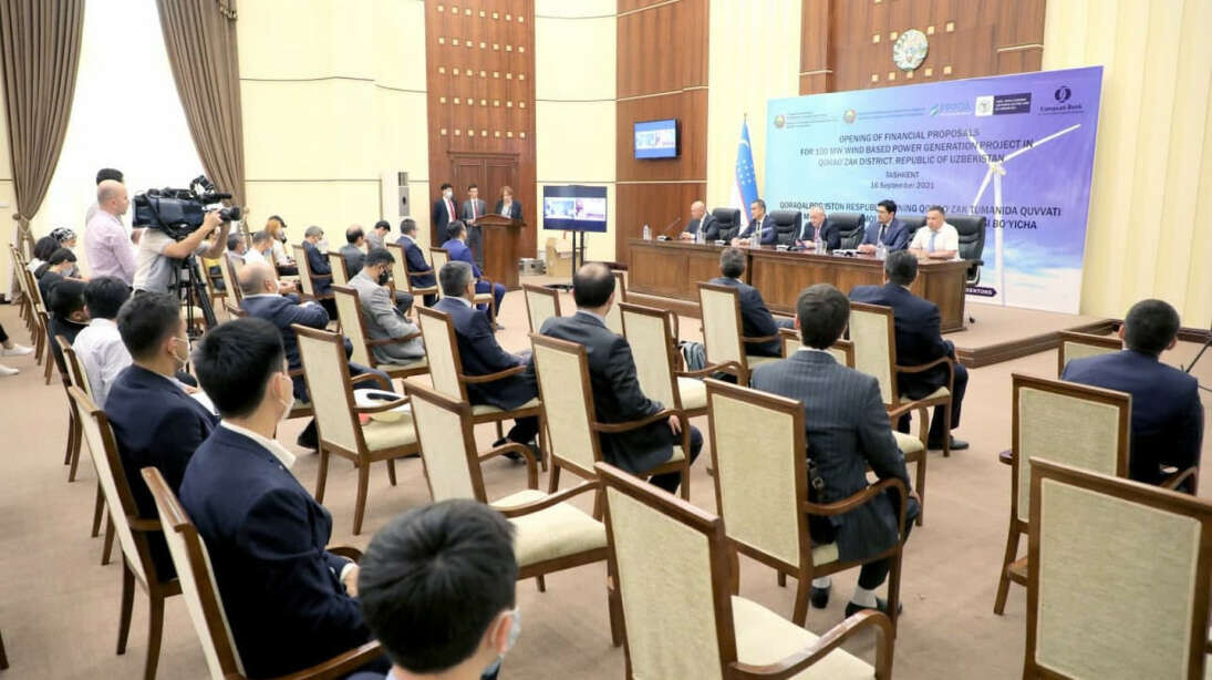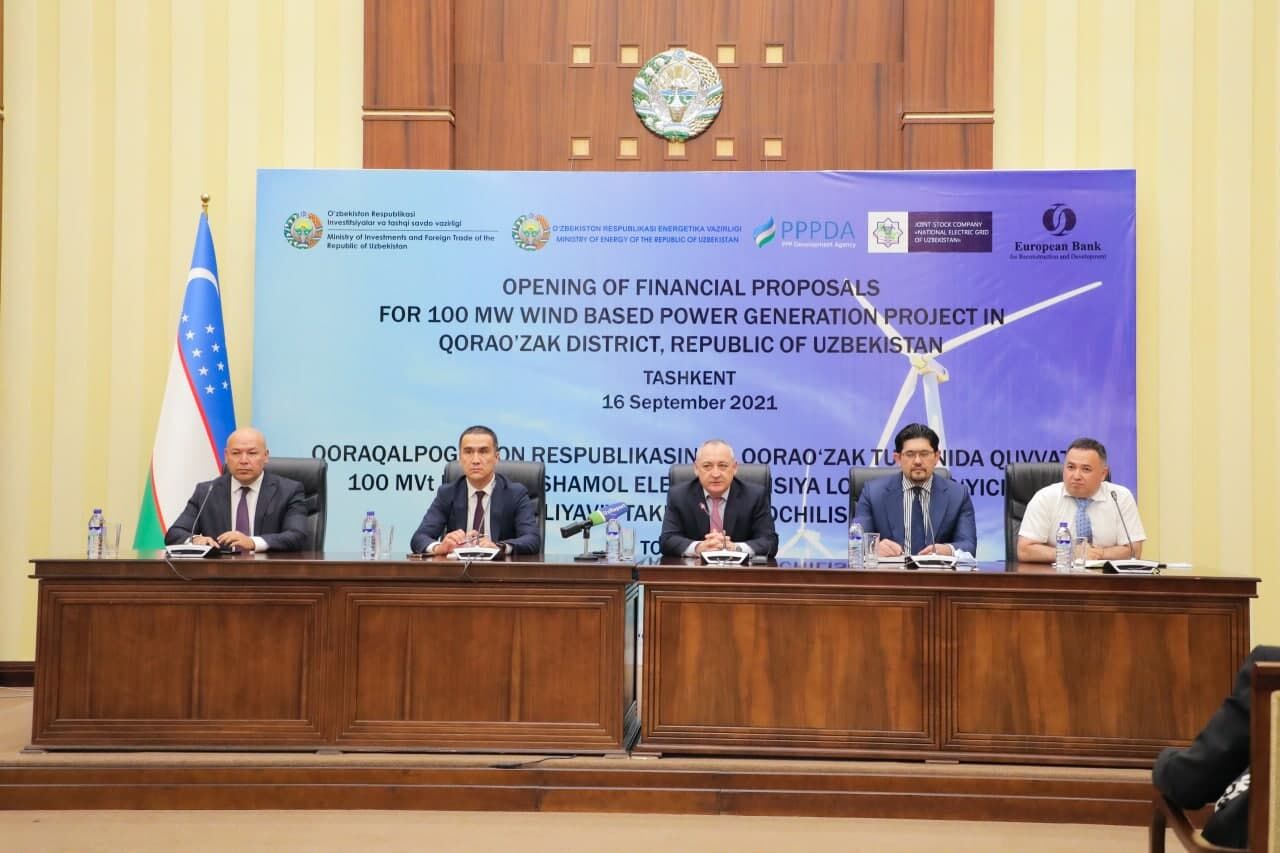 16 сентябрь куни Инвестициялар ва ташқи савдо вазирлигида ўтказилган тендернинг якуний босқичида Қорақалпоғистон Республикасида 100 МВт қувватга эга шамол электр станциясини қуриш учун БААнинг Abu Dhabi Future Energy Company PJSC (Masdar) компанияси, АCWА Power (Саудия Арабистони) ва Voltalia (Франция) компанияси ўзаро рақобатлашди.