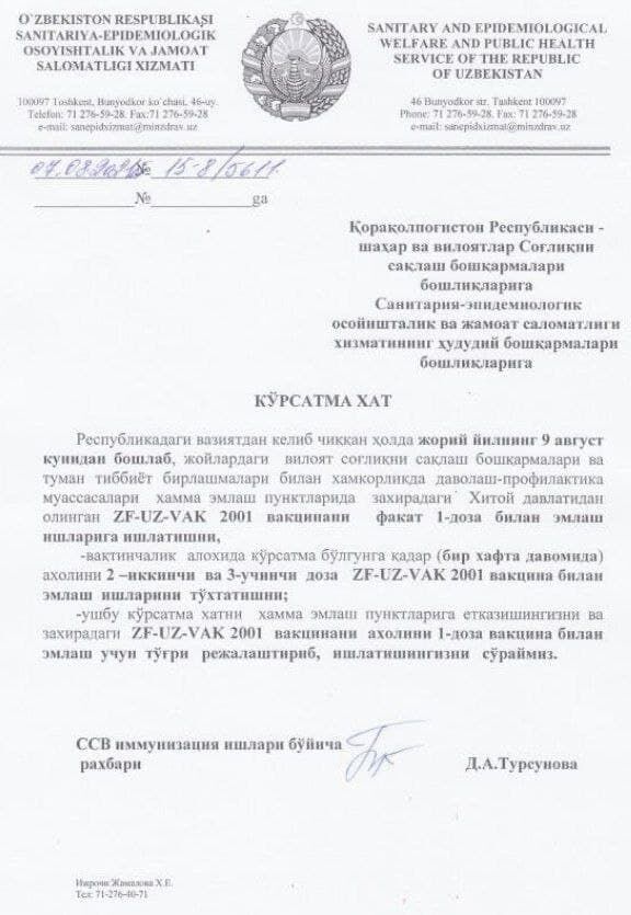 Ўзбекистондаги барча эмлаш пунктларида 9 августдан бошлаб бир ҳафта давомида ўзбек-хитой — ZF-UZ-VAC2001 вакцинасининг фақат биринчи дозаси билан эмлаш ишлари амалга оширилади.