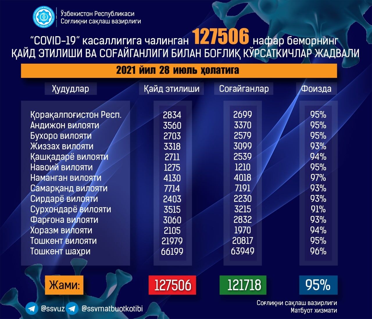 Кеча коронавирус бўйича энг кўп касалланиш ҳолатлари Қорақалпоғистонда (90), Жиззах (98), Самарқанд (82), Сурхондарё (95), Фарғона (75), Хоразм (50), Тошкент (109) вилоятларида ҳамда Тошкент шаҳрида (140) рўйхатга олинди.