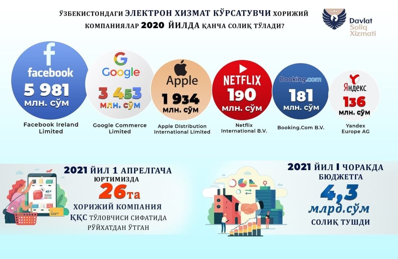 Давлат солиқ қўмитаси хабарига кўра, 2021 йил I чоракда электрон хизмат кўрсатувчи хорижий компаниялар Ўзбекистон давлат бюджетига 4,3 млрд сўм солиқ тўлаган.
