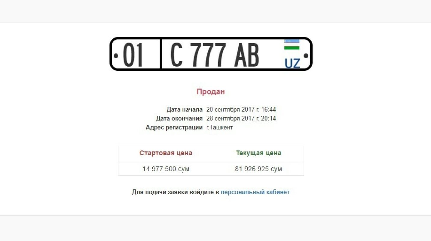 Бошланғич нархи 14 977 500 сўм бўлган С 777 АВ рақам белгиси 28 сентябрь куни соат 20:14 да сотилди.