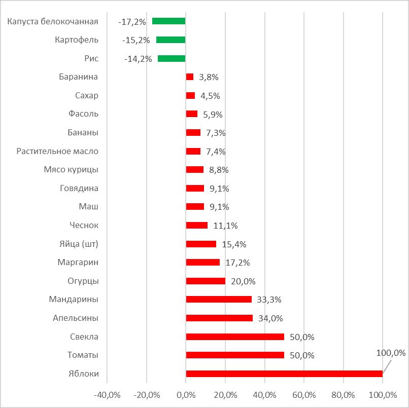Қолган 17 та маҳсулотнинг нархлари ошган. Нархлар ўсишида олма етакчи бўлиб, унинг минимал нархи 2 ой ичида икки бараварга ошган.