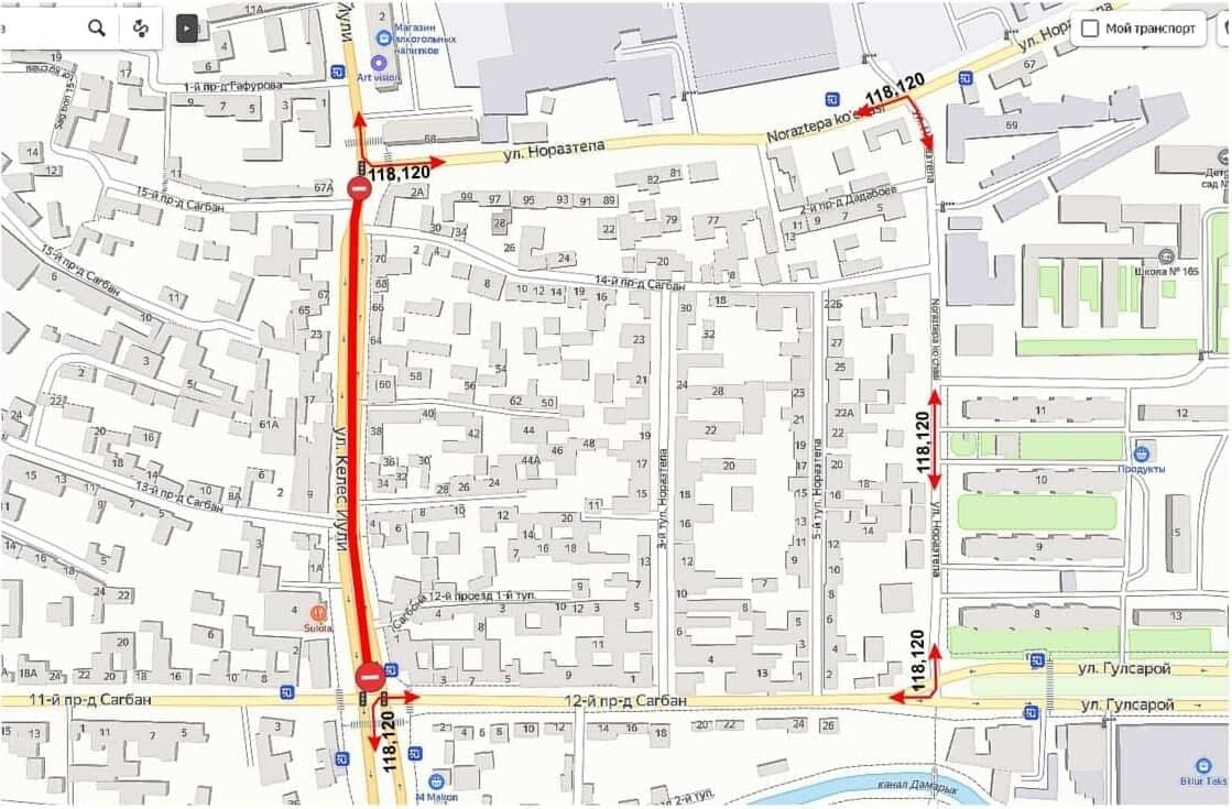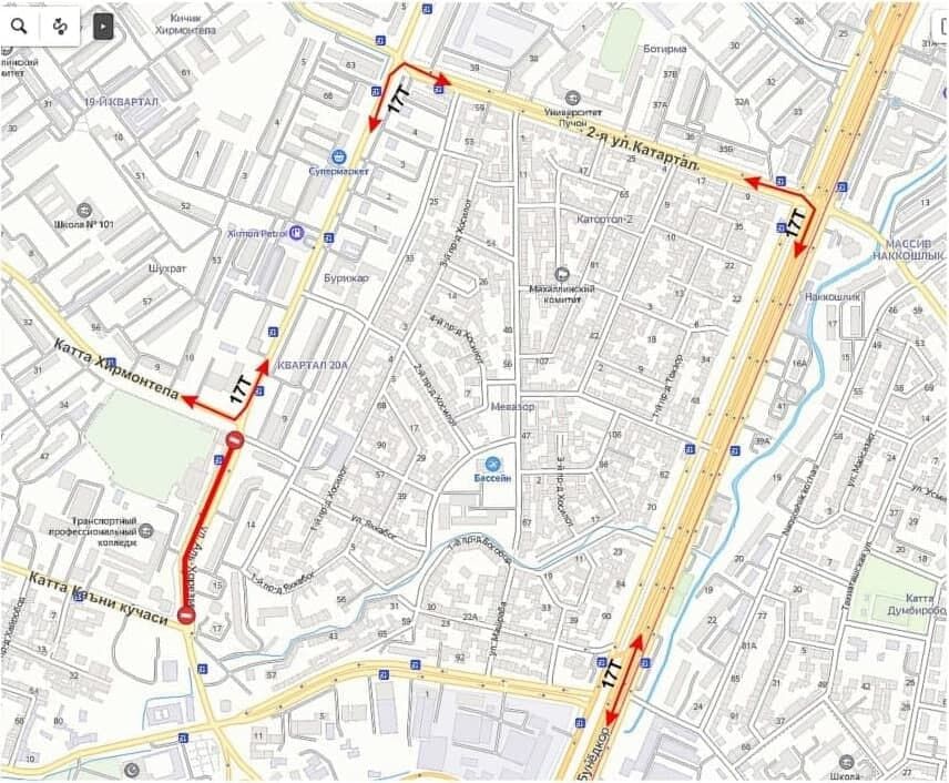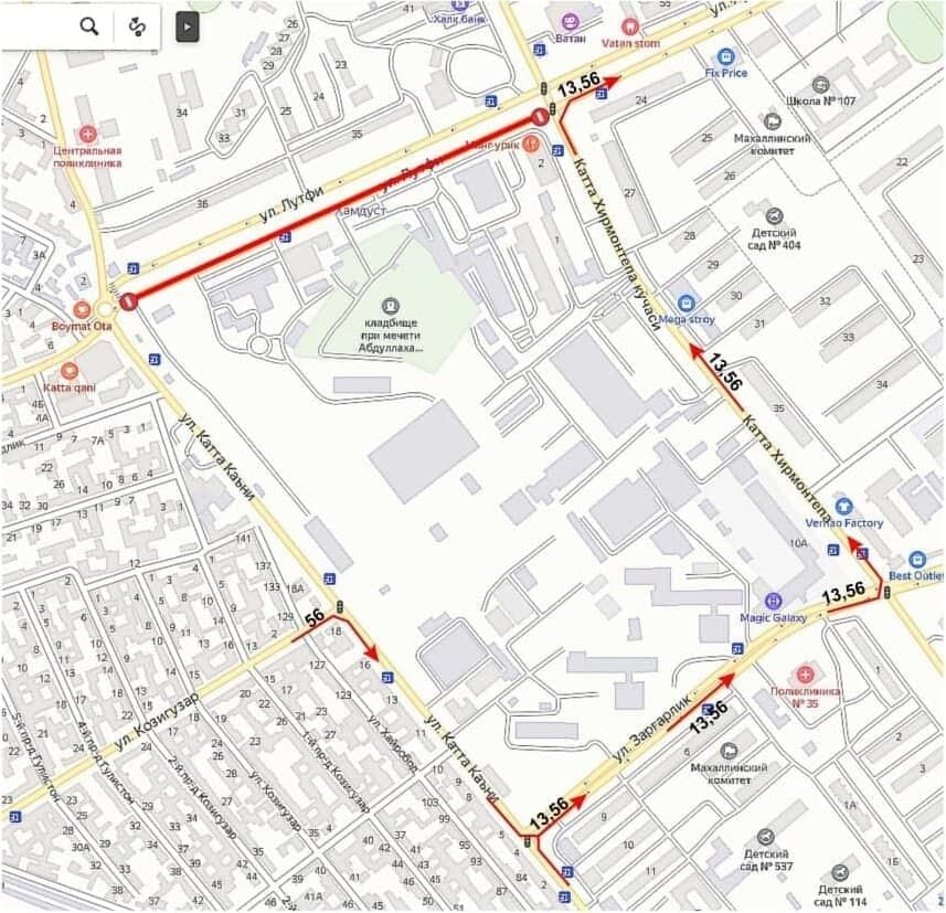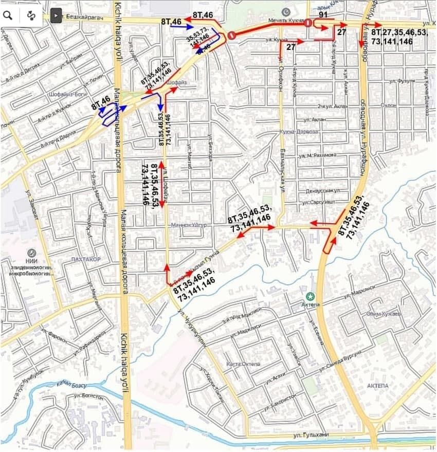 Ёпиладиган кўчалар орқали ҳаракатланувчи автобуслар йўналиши қуйида келтирилган харитадаги кўчалардан давом эттирилади.