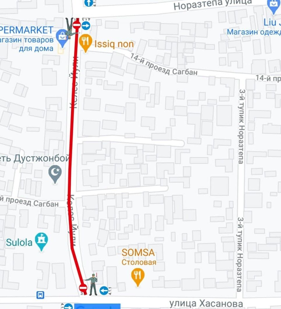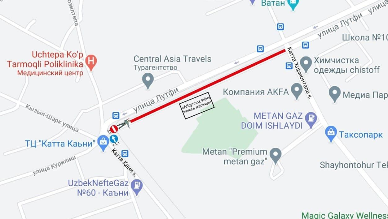 •  ул. Лутфий (только со стороны мечети, противоположная сторона остаётся открыта для движения) – от пересечения с ул. Катта Кани до пересечения с ул. Катта Хирмонтепа.