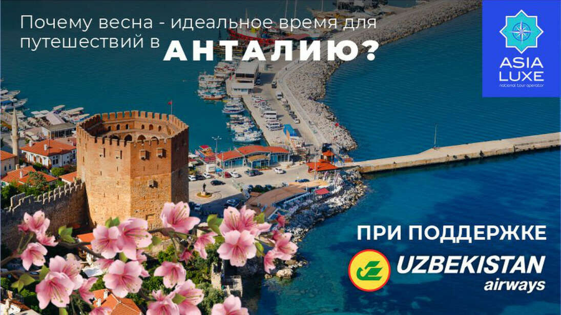 Ну а если вы надумали лететь в Анталию, то напоминаем, что компания Asialuxe Travel совместно с Uzbekistan Airways организовывает регулярные чартерные рейсы по направлению Ташкент – Анталия – Ташкент круглый год! Стоимость туристических пакетов на одного человека при двухместном размещении в апреле с концепцией «Всё включено» начинается от 7,2 млн сумов за недельный отдых и 8,3 млн сумов – за десять дней отдыха в Анталии.
