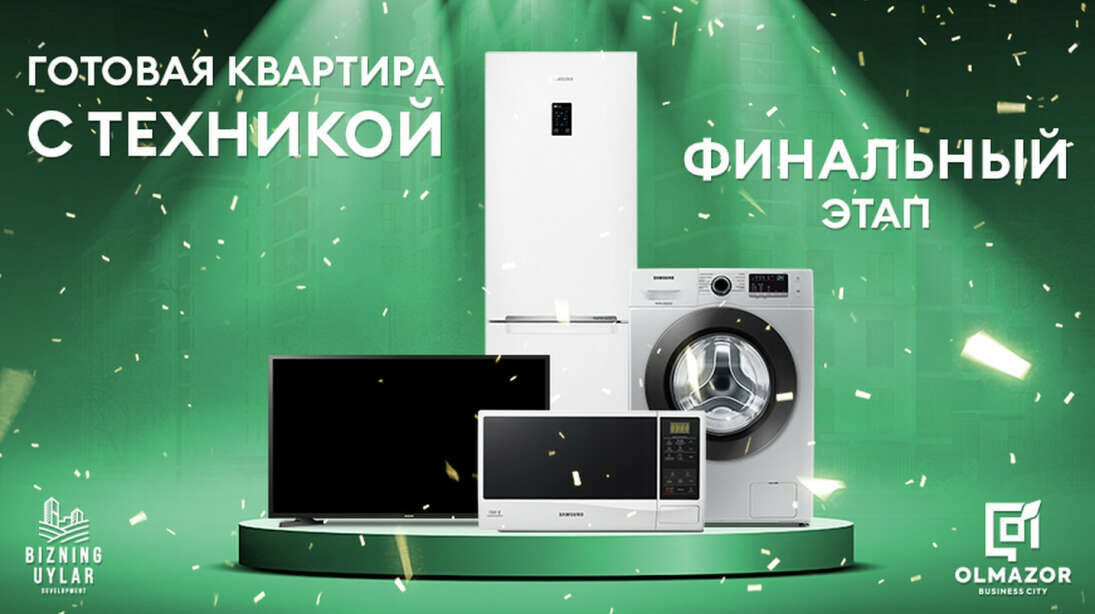 Все ближе пора новогодних праздников, а значит, остается все меньше времени, чтобы принять участие в предновогодней акции. Только в декабре, приобретая квартиру в ЖК Olmazor Business City, вы становитесь обладателем ценных подарков от компании Bizning Uylar Development. Покупателей ждет целый набор крупной бытовой техники для дома от мирового лидера компании Samsung: холодильник марки RB 31 FERNDWW Display/White, телевизор Samsung 43N 5000, автоматическую стиральную машину WW60J32G0PWULD 6/ White и микроволновую печь ME83KRW.