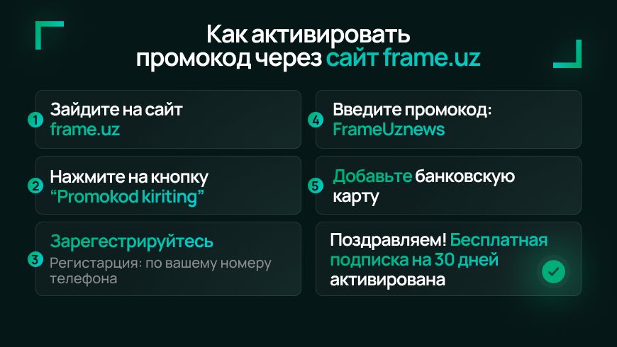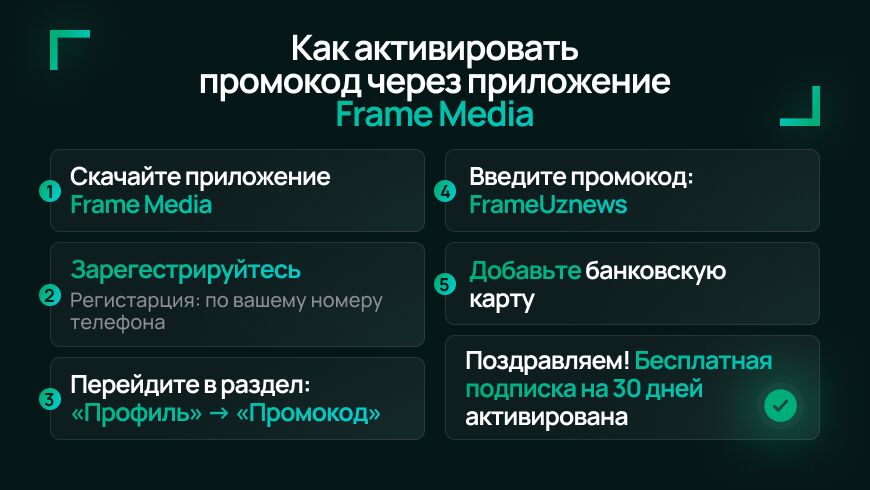 Активируйте его на frame.uz или в приложении Frame — и получайте целый месяц бесплатного просмотра контента на узбекском языке и на других языках.