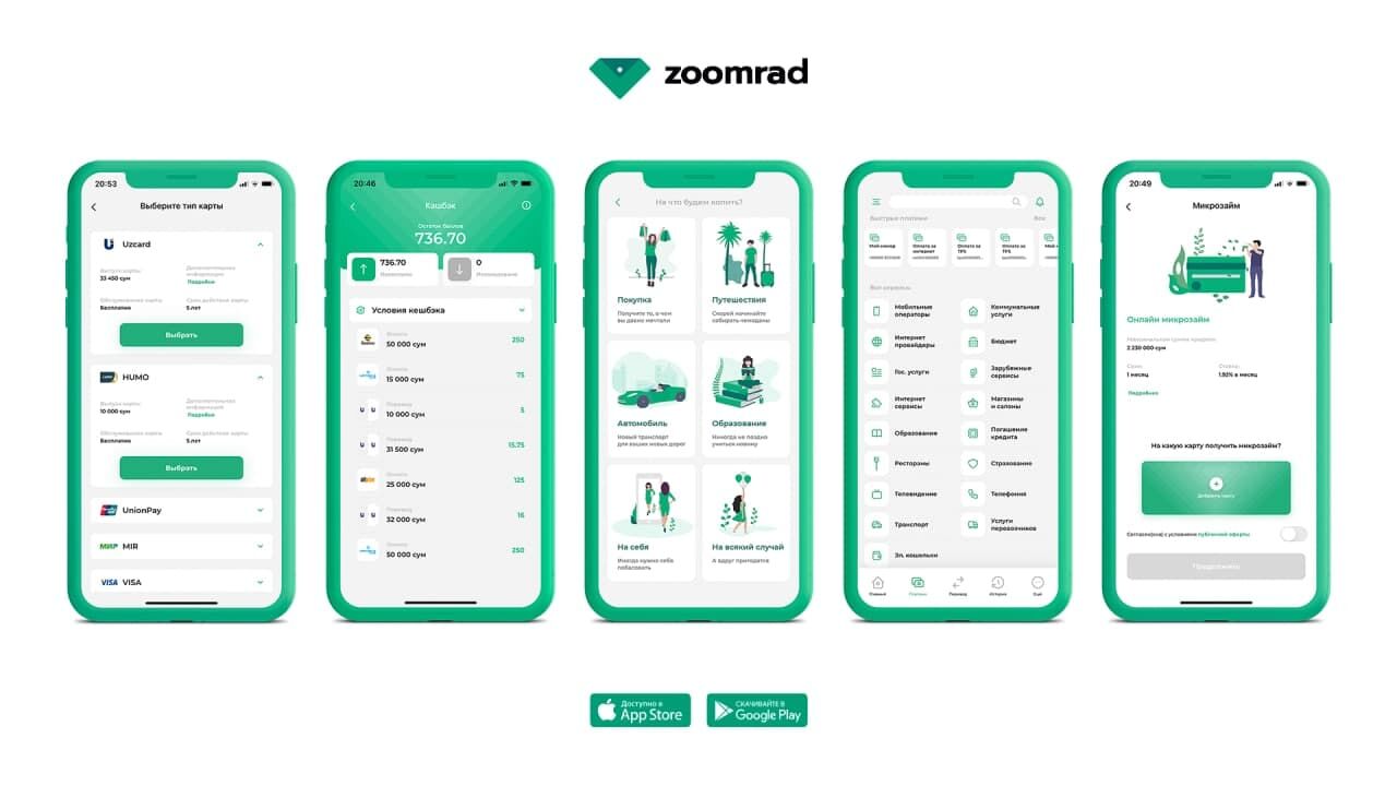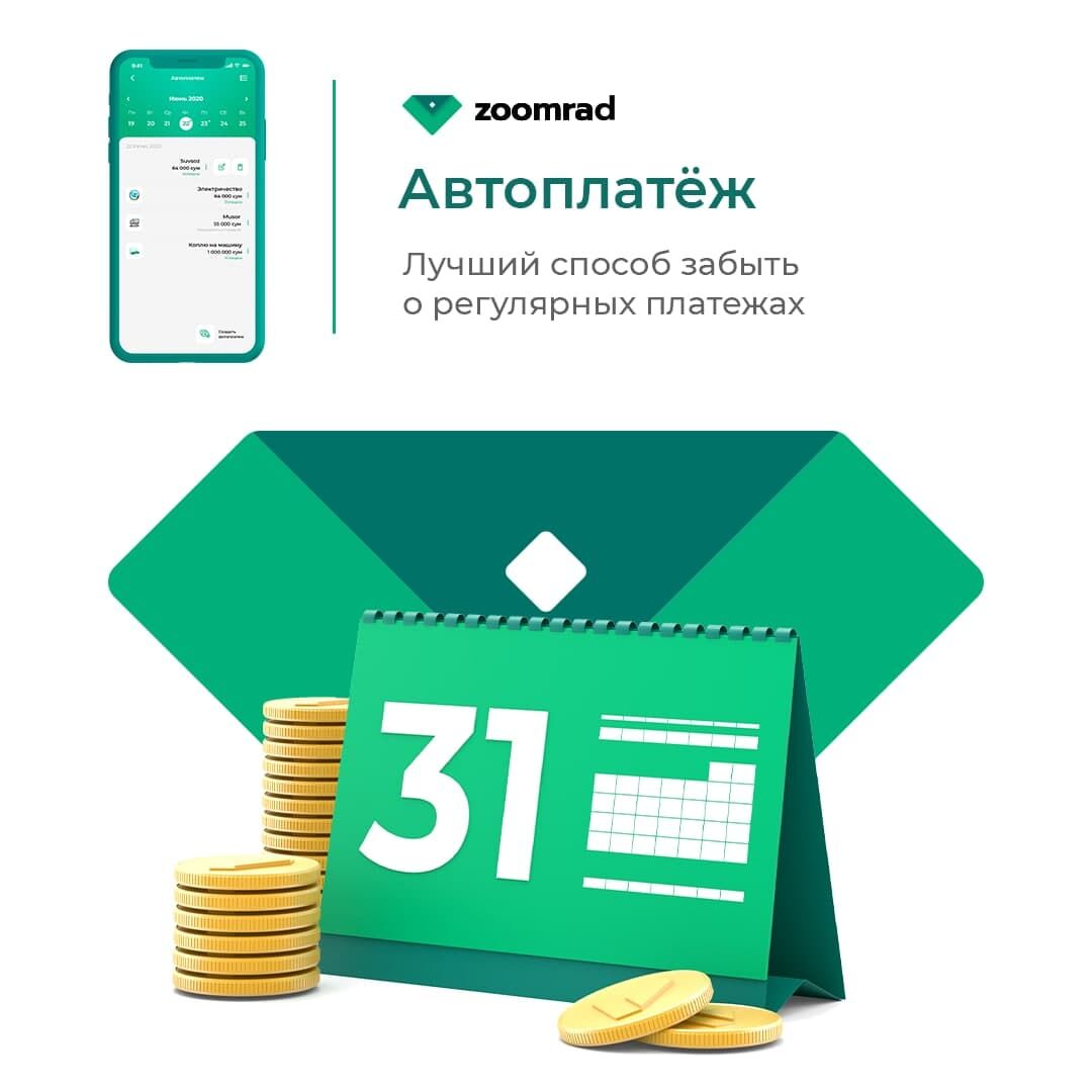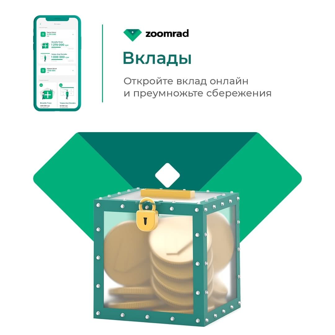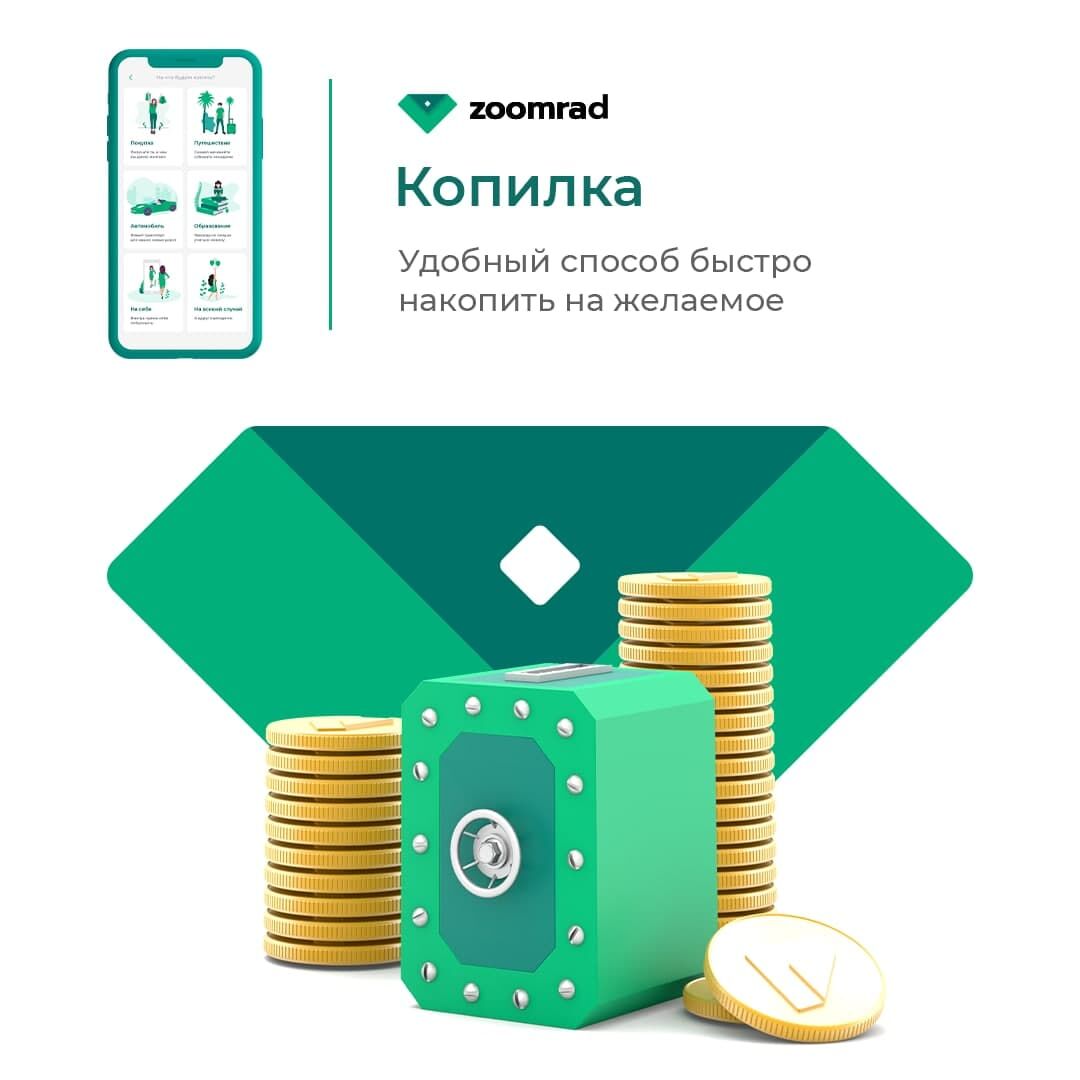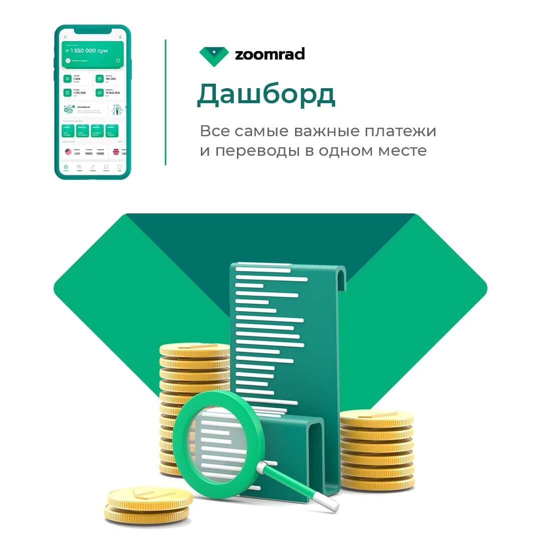 Маблағини сақлашда хотиржам бўлишни ва уларни кўпайтиришни истайдиган кишилар учун Zoomrad фойдали шартларга эга омонатларни, тезда пул керак бўлиб қолган кишиларга эса — микроқарз хизматини таклиф қилади. Мазкур хизматлардан иловада тезкорлик билан фойдаланиш мумкин.