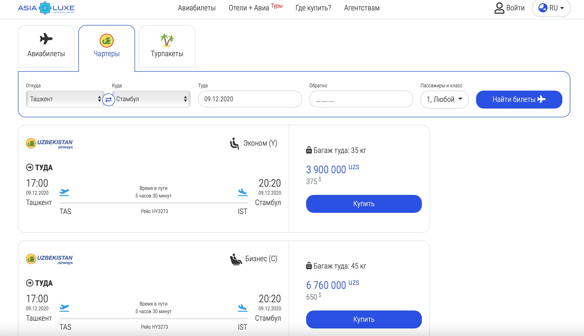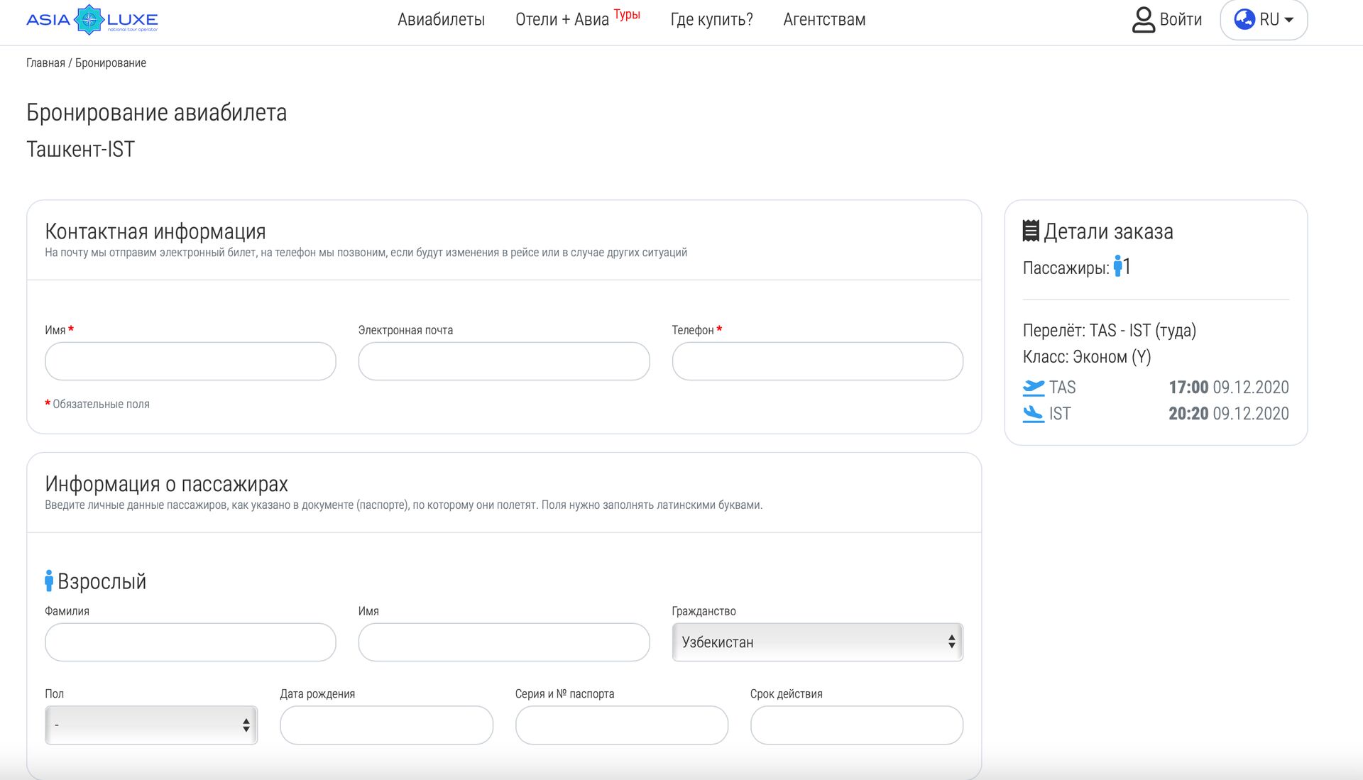 Больше нет необходимости тратить своё время на авиакассы и личное посещение турагентств. На платформе www.asialuxe.uz представлены как регулярные (Uzbekistan Airways), так и чартерные направления (Asialuxe Travel). Весь процесс максимально автоматизирован и требует минимального участия пользователя. Например, для покупки авиабилета вам необходимо совершить всего несколько шагов: