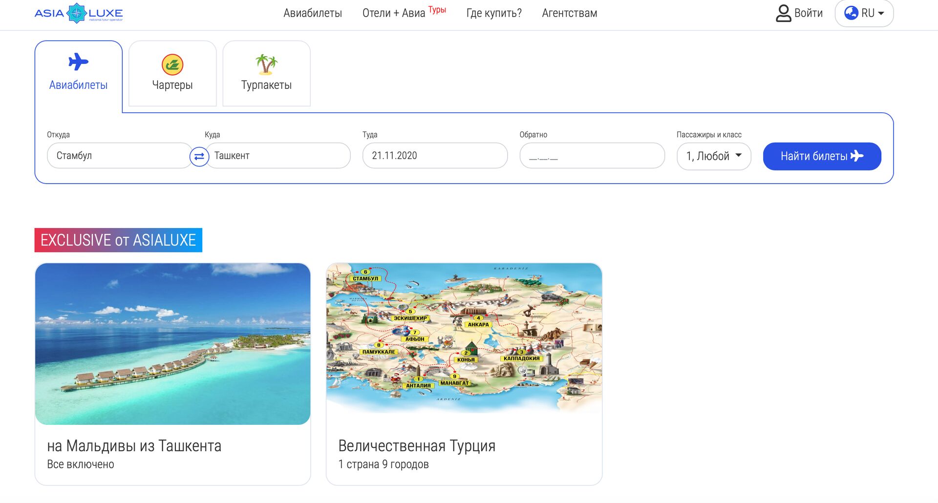 На сегодняшний день Asialuxe Travel активно осуществляет чартерные перевозки в Стамбул и Анталию. В конце года также состоится исторический групповой тур в 9 городов Турции, включая такие города, как Каппадокия, Конья, Анкара, Памуккале и другие. Также к Новому году доступны туристические пакеты в Стамбул, Анталию, а также невероятный и просто волшебный тур на Мальдивы.