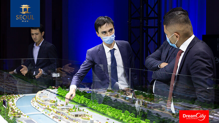 На входе в зал был установлен макет проекта Seoul Mun для того, чтобы гости мероприятия смогли лично ознакомиться с деталями проекта. Детализация макета дает полное представление о его масштабности, живописности и функциональных возможностях. Здесь менеджеры офиса продаж делились подробной информацией о видах, планировках и возможностях всех вариантов помещений для бизнеса, рассказывали об их конкретных преимуществах, подбирали индивидуальные предложения под персональный запрос.